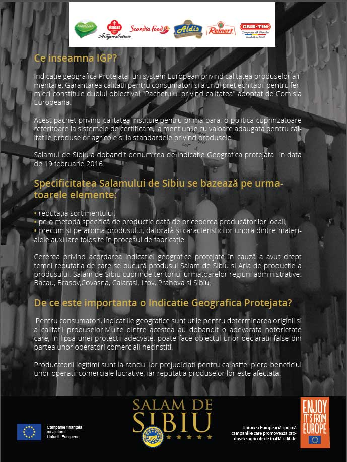 Established on May 7, 2014, the Association of PGI Sibiu Salami Producers brings together the only ones accredited to produce the real Sibiu Salami: founding members Agricola Bacau, Aldis Calaraşi, H & E Reinert Brasov, Salsi Sinaia, Scandia Romania and adherent member Recunoștința Prod Com -Filipeștii de Pădure.