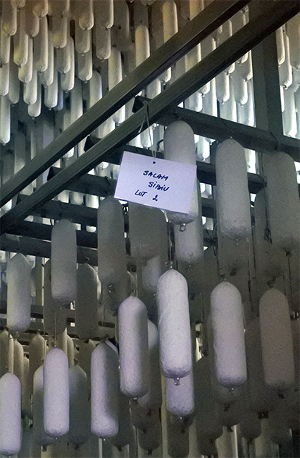 After manually stocking the drying and curing rooms, the sausages are sprayed with a solution of noble mold spores (Penicillium nalgiovensis or the above-mentioned mix) and are then left to sit for about six hours to settle. After 10-12 days from seeding the sausages are covered in mold mycelia. As the drying process advances, the mycelia grows and consumes nutrients (sugars, proteins, lipids) from the salami paste, releasing metabolic products that impart the sausage its specific flavor.
